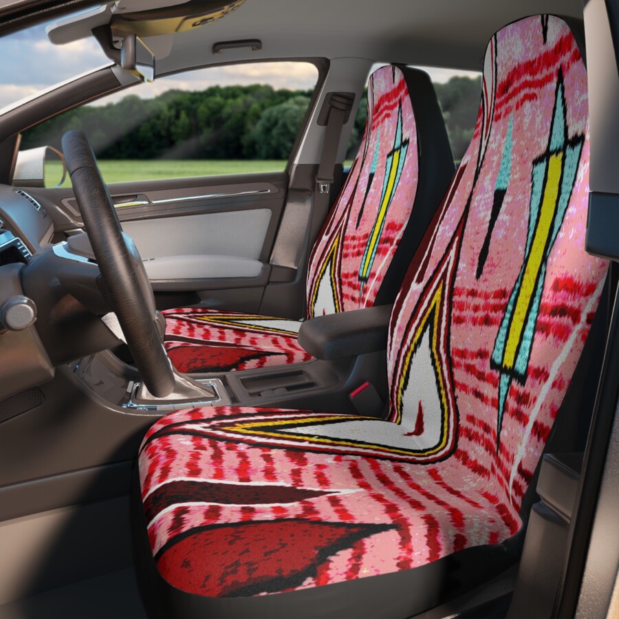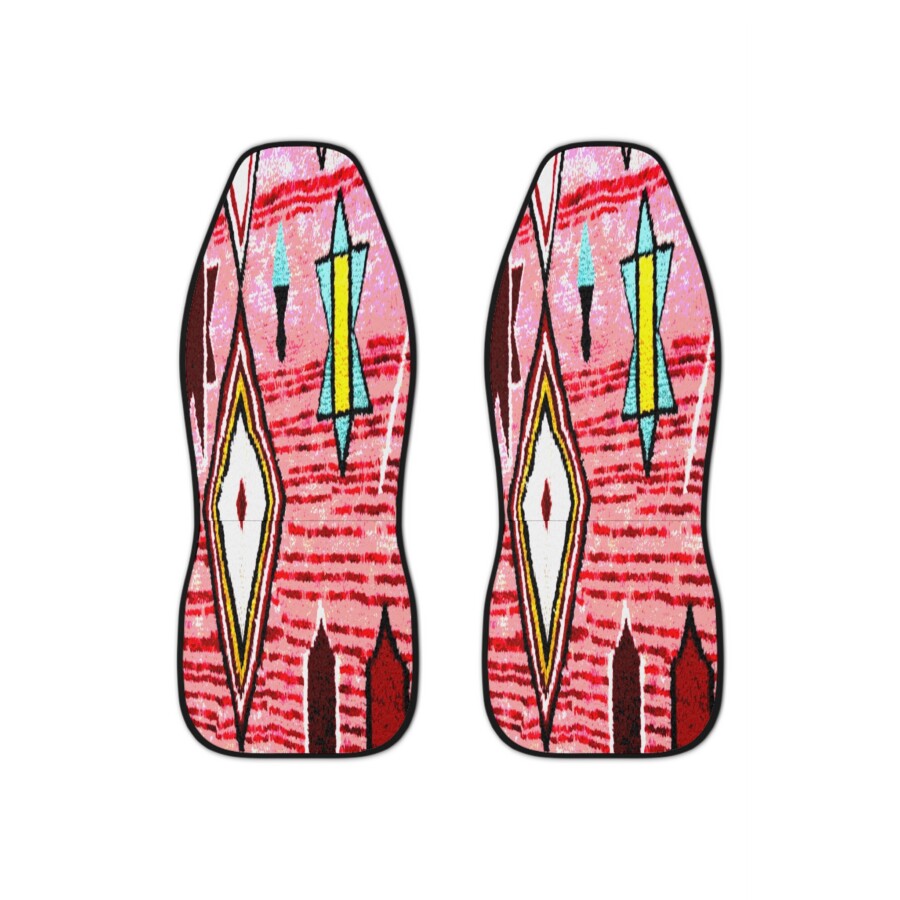 These Boho Faux Moroccan Rug Car Seat Covers bring a boho, faux-vintage rug look to your daily drive. The high-contrast Moroccan-inspired print reads like a well-traveled textile — warm, layered, and full of character — and instantly shifts a plain interior into something collected and personal. Slip them on for an easy refresh: the elastic lining and dual hook straps lock the covers in place so they sit snug against the seat. The front surface feels soft and smooth, while the thick polyester holds up against weather, spills, and fading. They come as a pair with matching prints and a black-backed finish that hides wear. Note the covers aren’t compatible with seats that have side airbags. These are for drivers and riders who love a lived-in, worldly car interior and want that rug-like aesthetic without the upkeep of real fiber.
