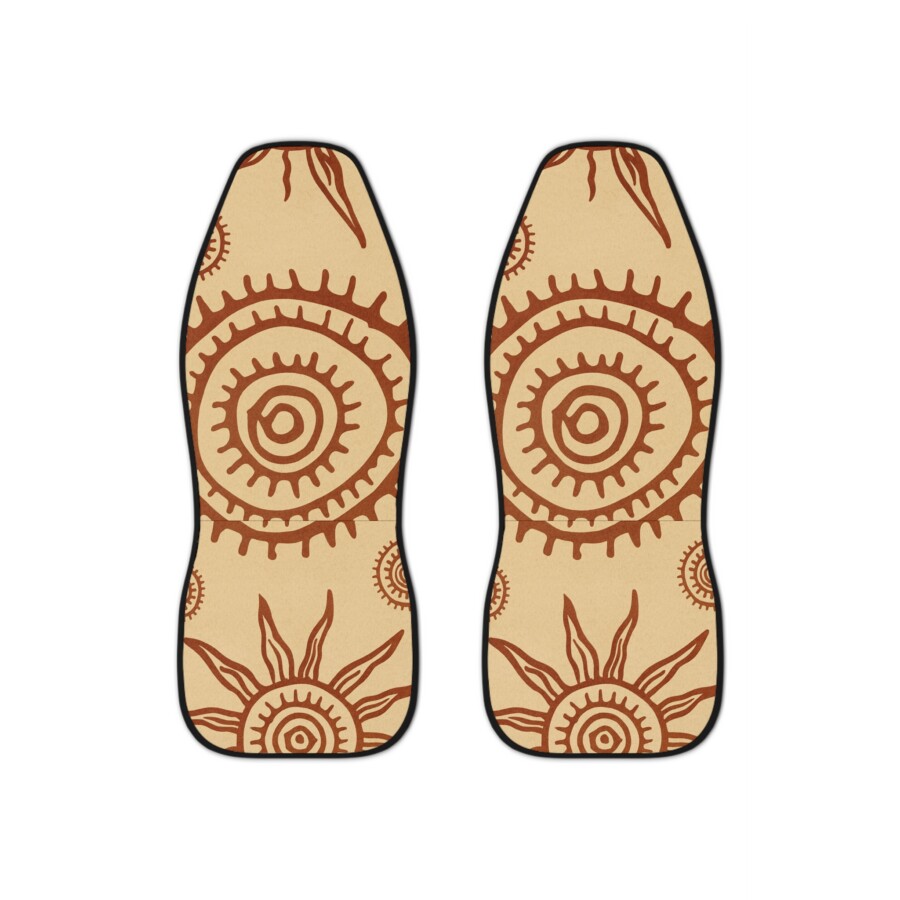 Boho Suns Car Seat Covers, Boho covers gift for new driver, Bring a warm, sun-soaked vibe into every drive with these hand-drawn sun motif car seat covers. The earthy terracotta pattern on a sandy beige background creates a calm, desert-inspired look that ages gracefully and hides everyday wear. Slip them on in minutes — the elastic lining and dual hook straps keep the covers snug through turns and errands. The front feels soft against clothing, while the thick polyester resists spills, fading, and tears so your seats stay protected for seasons of road trips and slow mornings. Note: not compatible with seats that have side airbags.