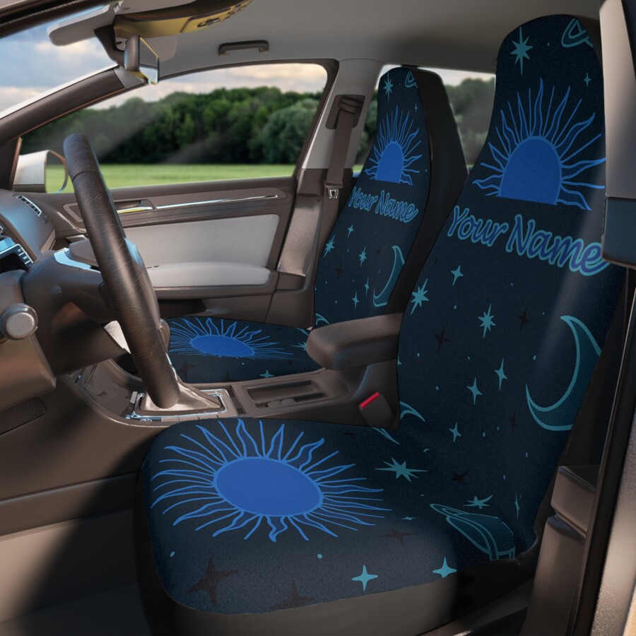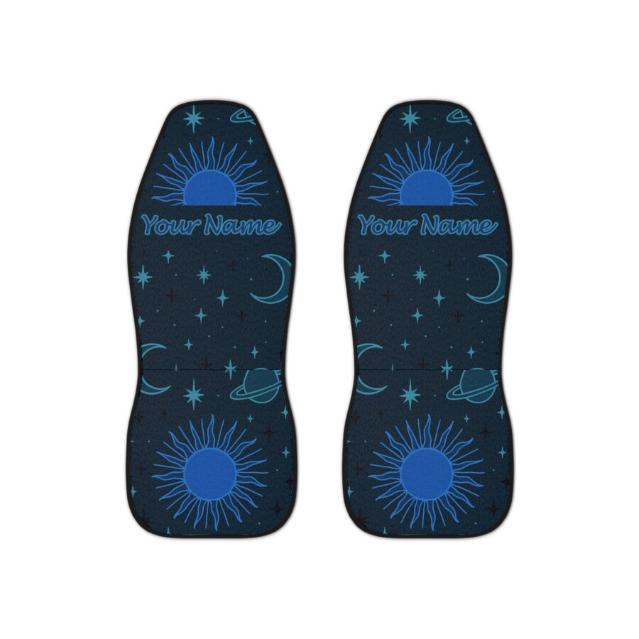 Celestial Night Personalized Car Seat Covers, Bring nighttime calm and a touch of celestial charm to every drive with these hand-designed car seat covers. Deep navy fabric is printed with a soothing blue sun, crescent moons, planets, and scattered stars — a subtle cosmic scene that settles the mind on long commutes or late-night runs. The soft front feels pleasant against clothing, while the heavy-duty polyester and secure elastic hook straps hold the cover firmly in place. They slip on quickly and protect seats from spills, wear, and fading, making your car interior feel intentional and cared-for. Naming space on the back of the headrest area lets this set feel personal without shouting for attention. A refined, quiet way to bring personality and protection to your daily drive.