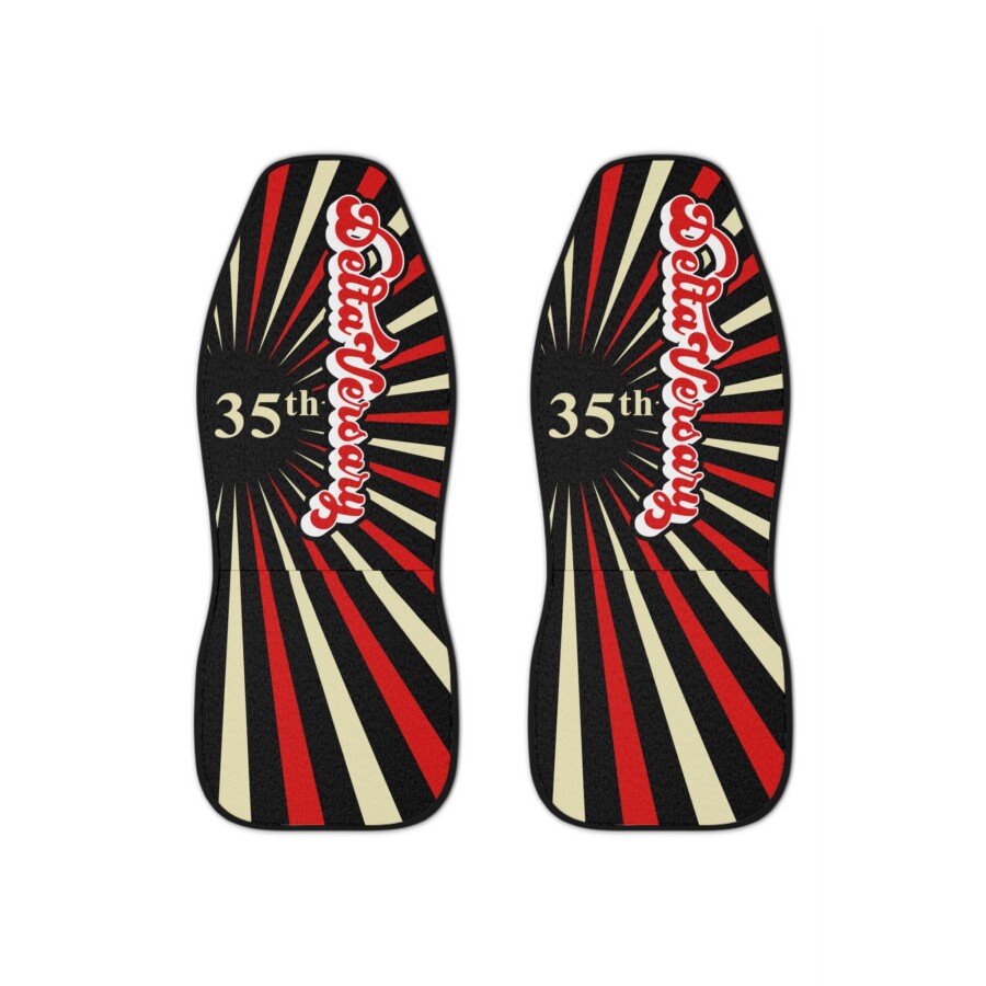 Delta Anniversary car seat covers, Give your car’s interior a bold, celebratory pulse with these custom seat covers. The design channels vintage carnival energy — radiating red, cream, and black rays around a central “35th” mark and a retro-script name. The thick polyester face feels soft to the touch, while an elastic lining and dual hook straps hold each cover firmly in place. They slip on quickly, protect against spills, fading, and wear, and present identical artwork on both seats for a matched, vintage-inspired look. Note: not for use on seats with side airbags.