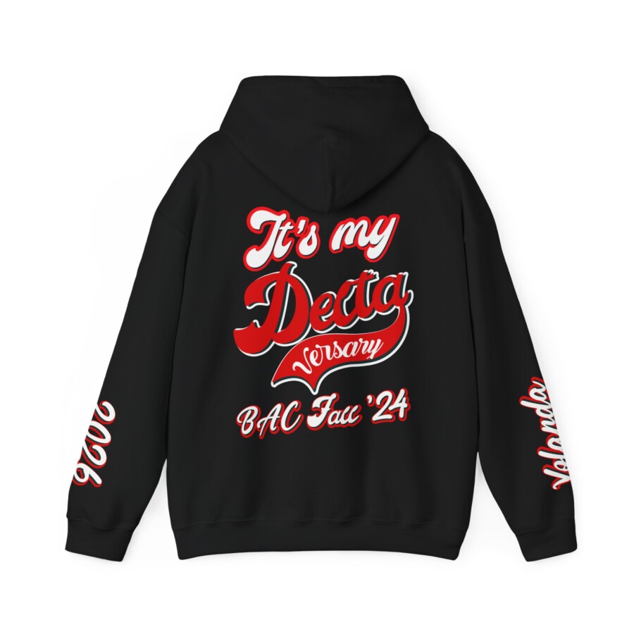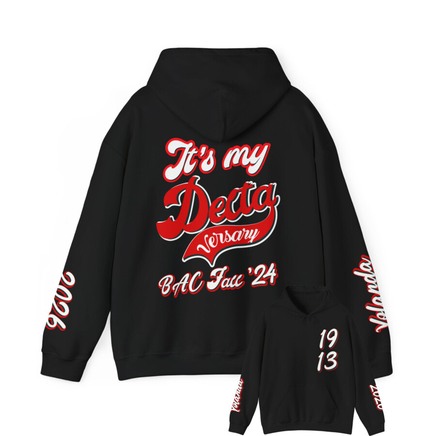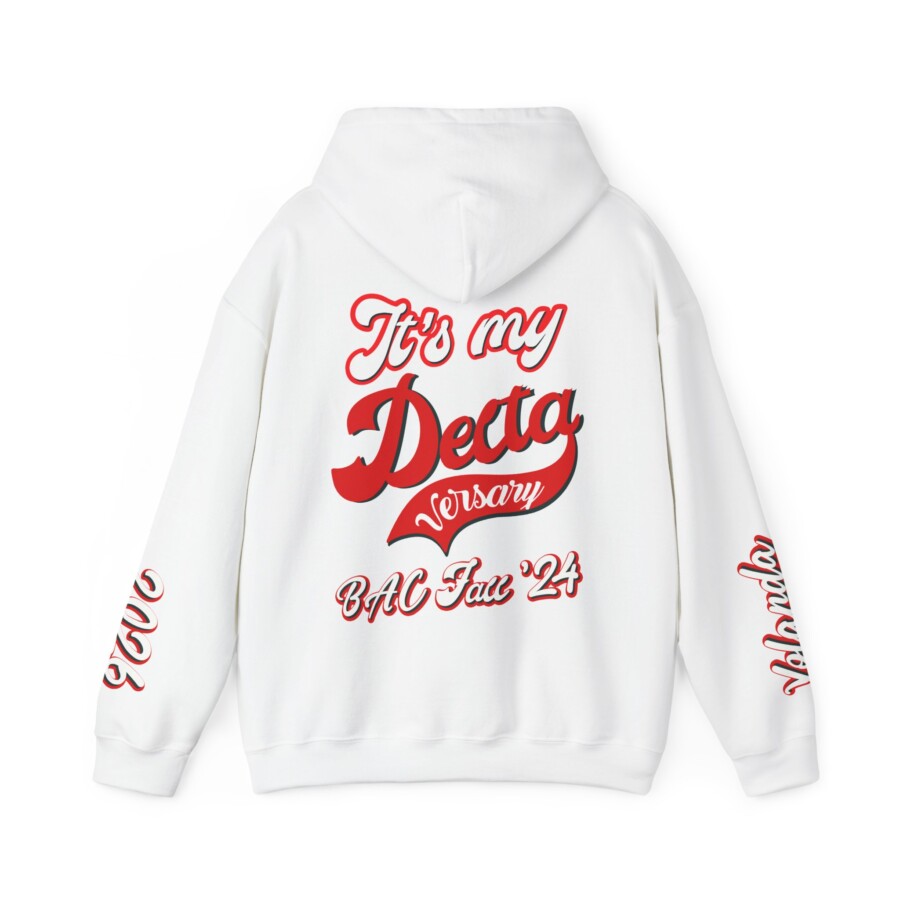 Deltaversary Hoodie — “It’s My Deltaversary” 4 printed sides, Front, back, left and right sleeves, gift for your line sisters, This soft, roomy hoodie carries a proud, nostalgic energy — the kind that turns alumni meetups, chapter events, and late-night study traditions into memories. Bold script and vintage-inspired numbers sit on a clean white canvas, while matching sleeve lettering creates a wrapped, collegiate feel. The hood tucks you into warmth; the kangaroo pocket keeps hands and playlists close. Wear it to chapter socials, campus walks at dusk, or casual weekends when you want to show quiet affiliation and shared history without shouting. It drapes comfortably, ages well, and feels like something you reached for on a chilly morning before a familiar ritual.