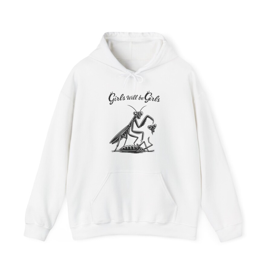 Girls Will Be Girls Hoodie, Gothic Mantis Illustration Hoodie, Soft, roomy, and quietly bold — this hoodie wraps you in cozy warmth while making a subtle statement. The minimalist monochrome illustration and delicate script headline sit centered on a clean white field, creating a look that’s both modern and slightly nostalgic. Wear it on slow mornings with coffee, during late-night study sessions, or layered for brisk walks. The pouch pocket and double-lined hood add everyday practicality, while the smooth cotton-poly blend keeps prints crisp and fabric soft after many washes. Simple, comfortable, and expressive — it feels like a familiar friend you reach for whenever you want calm confidence.