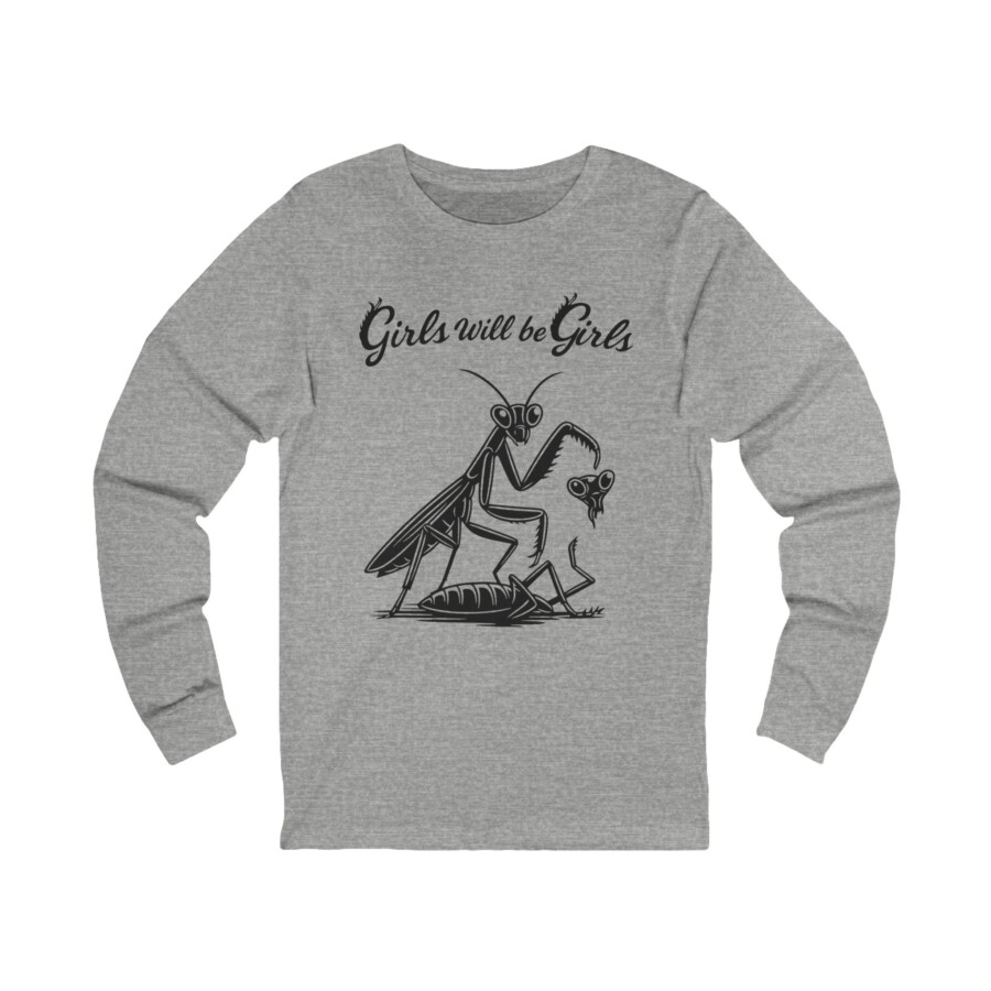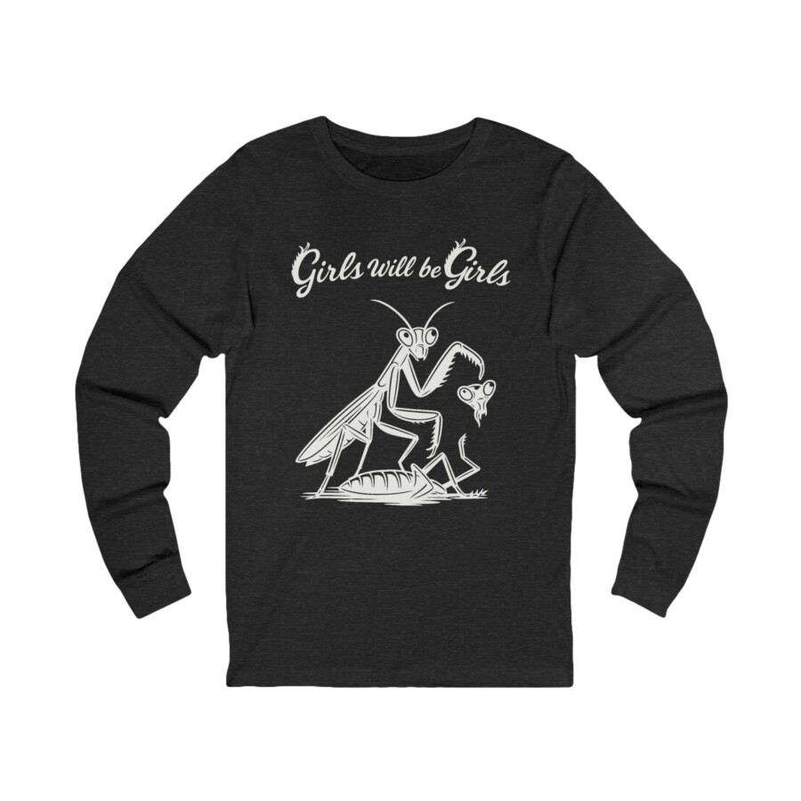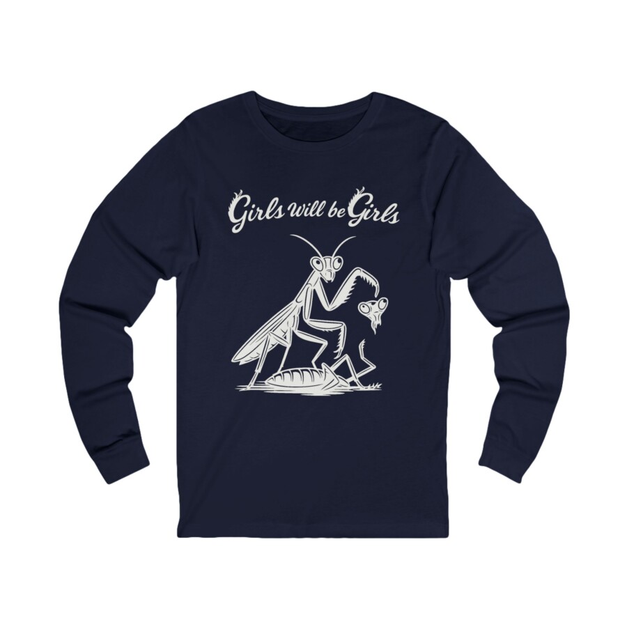 Girls Will Be Girls shirt —Girls gift Praying Mantis Graphic long sleeve Tee, Lightweight long-sleeve tee with a cheeky, hand-drawn mantis illustration and the phrase “Girls will be Girls.” Soft, breathable fabric and a retail fit make it easy to layer or wear solo. The artwork has a slightly vintage, sketch-like feel that reads playful and a little irreverent — great for people who like feminist humor with a dark, whimsical twist. Wear it to casual meetups, coffee runs, protests, or while sketching in the park. The shirt moves with you and keeps its shape through washes thanks to reinforced seams and a ribbed collar.