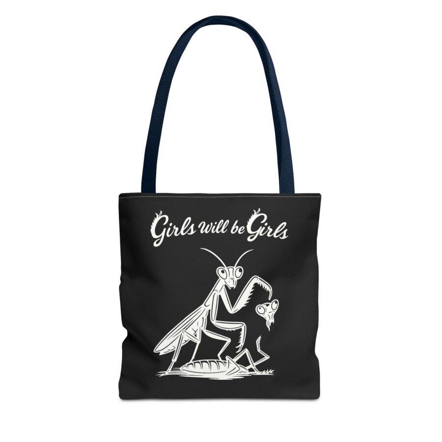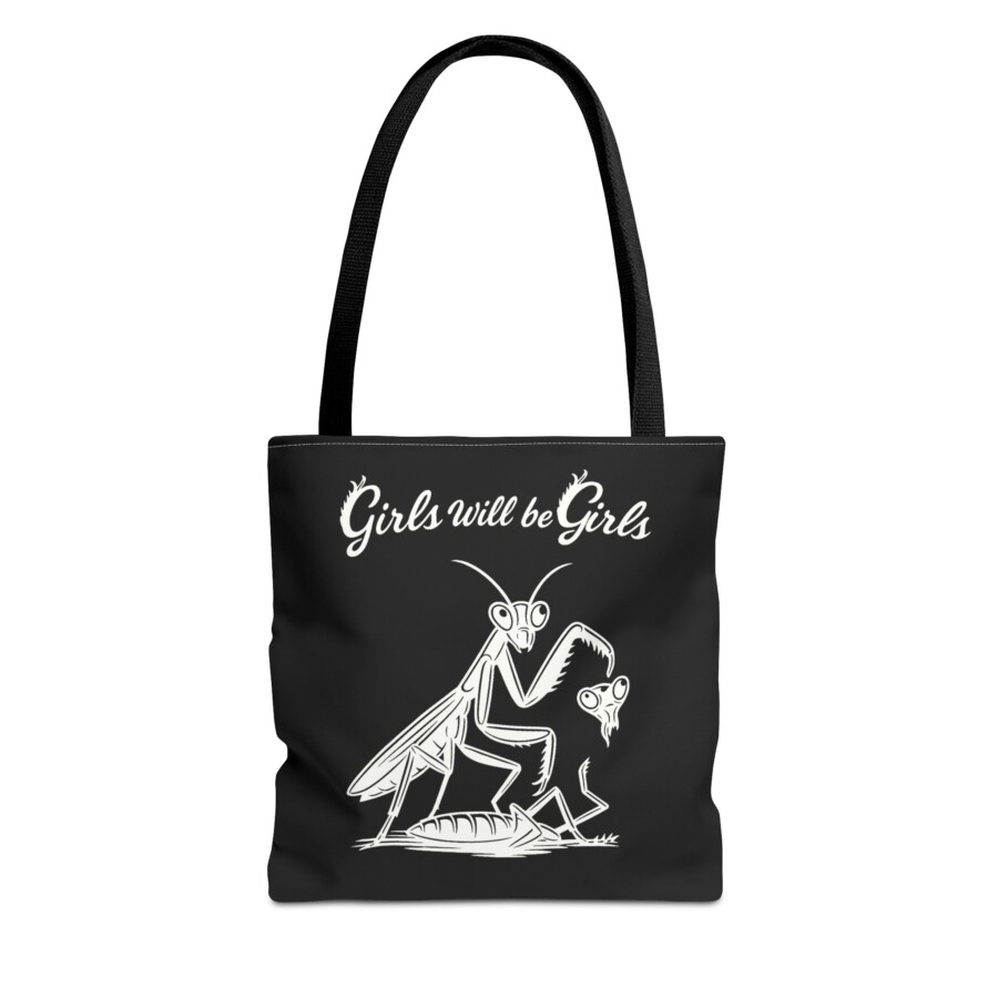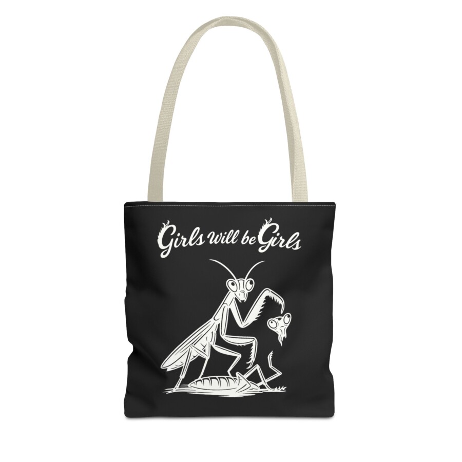 Girls Will Be Girls Tote Bag, This roomy polyester tote blends cheeky humor with bold graphic style — a black, everyday carry that starts conversations. The monochrome illustration of a praying mantis and its smaller companion, paired with the hand-lettered “Girls will be Girls” headline, gives the bag a tongue-in-cheek, feminist-energy vibe. Sturdy medium-weight fabric and boxed corners keep shape and capacity, while reinforced handles and neat inner laminate make it travel-ready: groceries, books, market finds, or the daily commute. It wears well with casual layers and market runs, and the subtle contrast stitching and handle-color options let you match a look without losing the graphic impact.