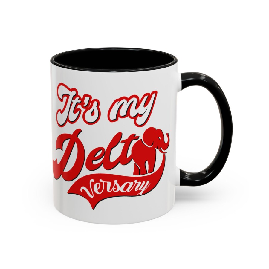 It’s My Deltaversary Coffee Mug, This ceramic accent mug brings a bright, playful touch to mornings and late-night study sessions. Bold, retro-inspired lettering and a small elephant motif read as a proud celebration — a quiet nod to sorority memories and sisterhood rituals. The colored interior and handle contrast against a glossy white exterior, making the design pop while your coffee, tea, or cocoa steams inside. It sits heavy enough for daily use, slides easily into the dishwasher or microwave, and resists fading so those red tones stay vivid through routines and reunions. Reach for it between classes, at the kitchen counter, or while catching up with sisters over a video call — it holds both beverage and memory.