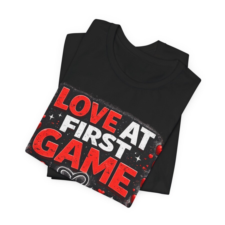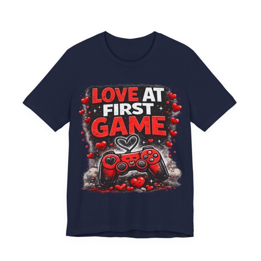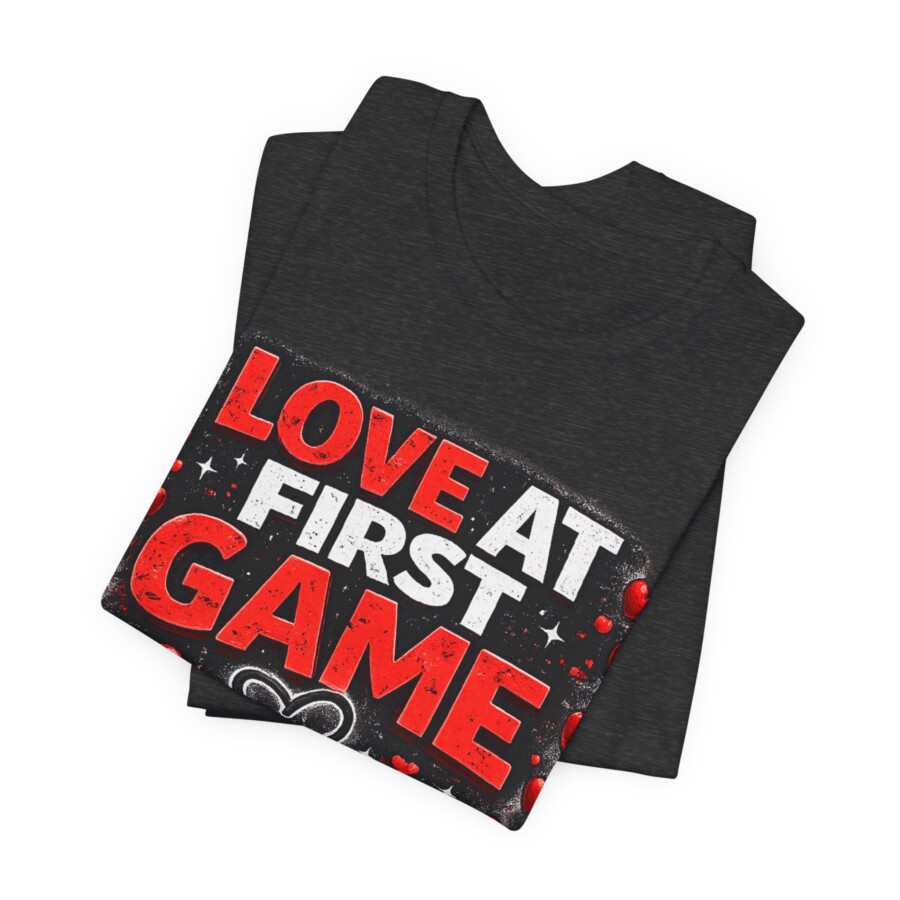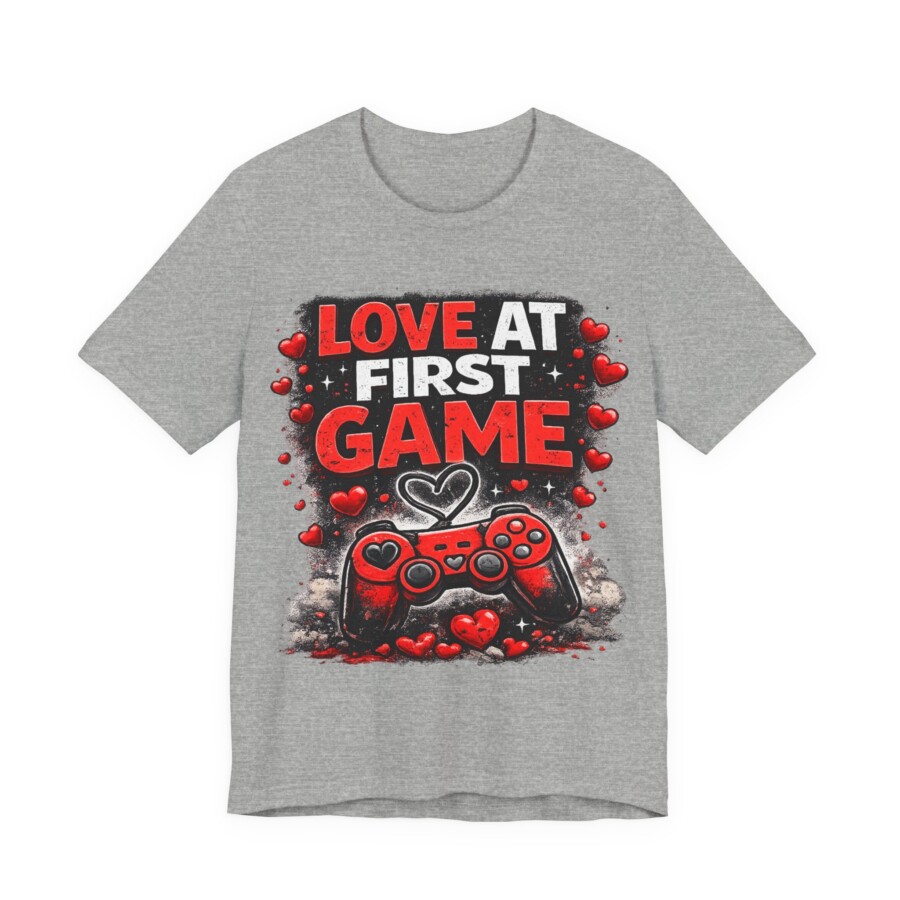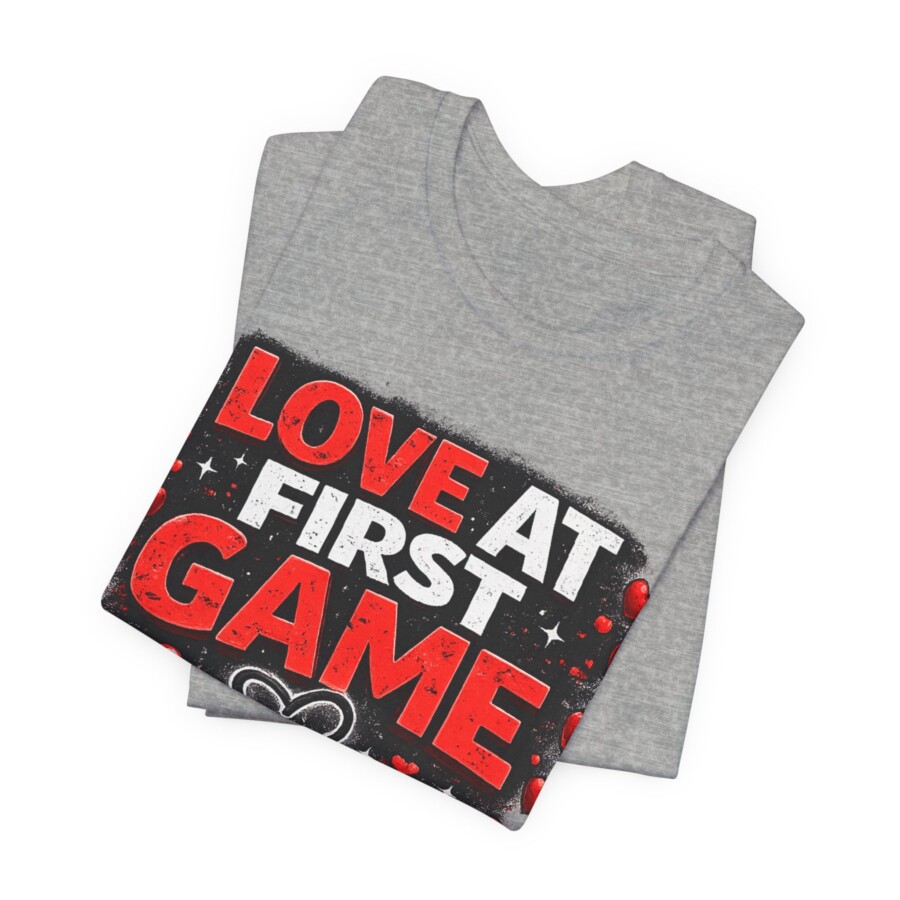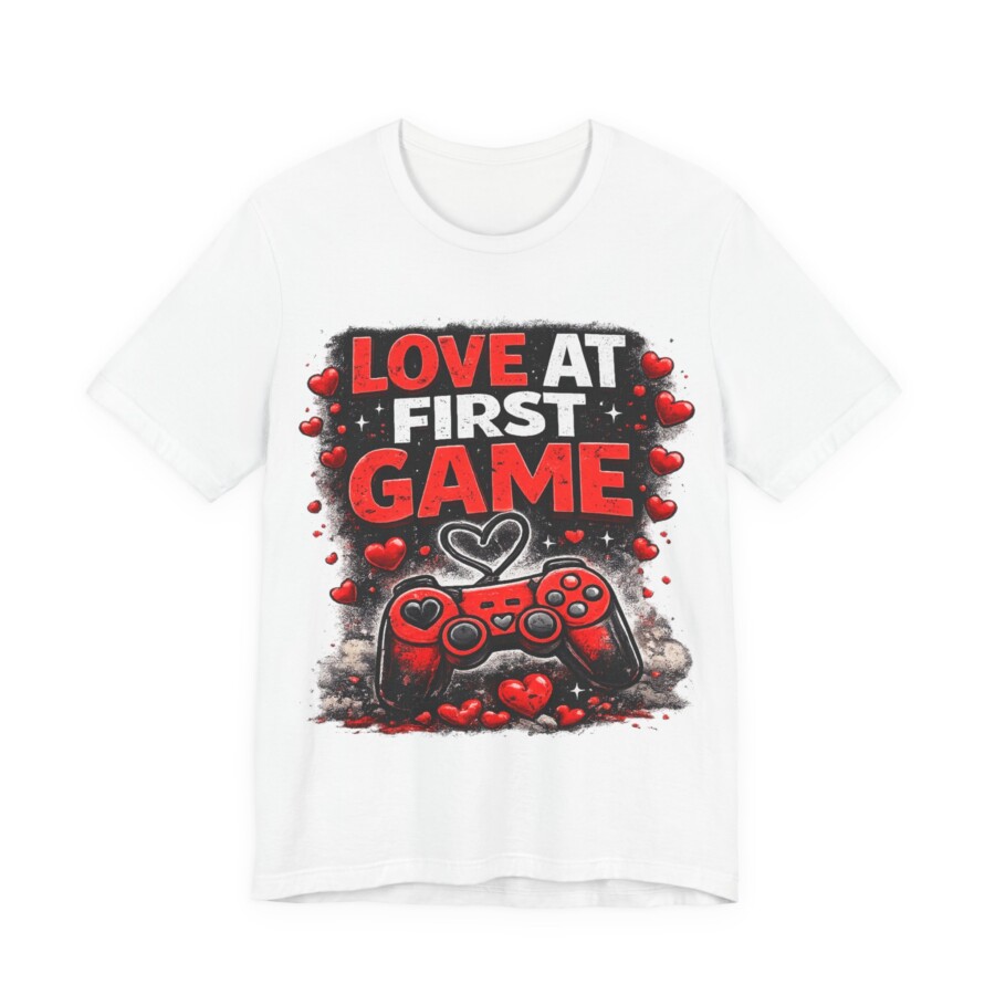 Love at First Game Shirt, This lightweight tee brings playful gamer energy to everyday wear. Bold red lettering and a heart-shaped game controller pop against a soft white background, turning a casual shirt into a statement about passion for play and connection. The retail fit and breathable Airlume cotton make it easy to layer under a jacket or wear on its own during long sessions — comfortable, clean, and built to hold shape. Small details like a ribbed collar, shoulder tape, and tear-away label keep the shirt feeling tidy and irritation-free. It lands naturally in a gamer’s wardrobe for cozy nights in, local meetups, or casual outings where personality matters more than formality.