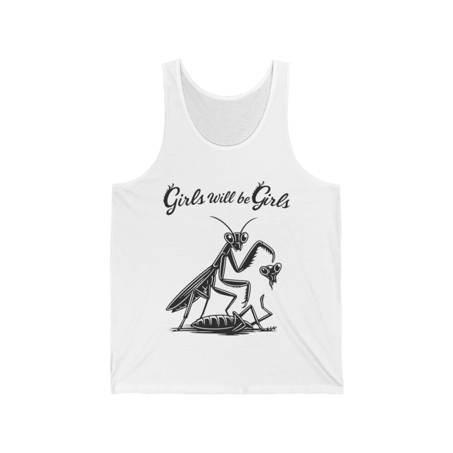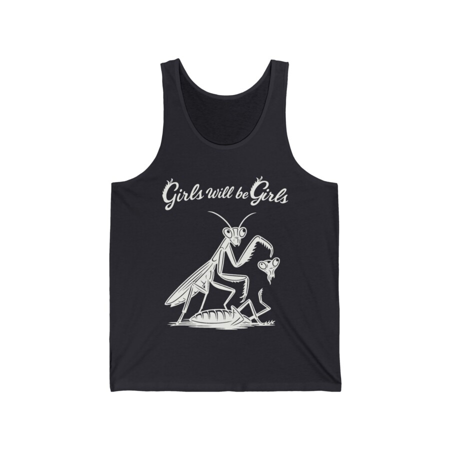 Praying Mantis Tank Top, Girls Will Be Girls, Light and breezy, this tank carries a playful, slightly surreal vibe — a vintage-style praying mantis sketch paired with the hand-lettered phrase “Girls will be Girls.” It feels like a wink to anyone who loves quirky, nature-inspired graphics and a relaxed, lived-in look. Wear it to weekend markets, late-summer bonfires, or layered under an open flannel for an offbeat, easygoing outfit. Soft fabric and a retail cut keep the silhouette flattering without fuss, while the understated monochrome art lets the illustration take center stage.