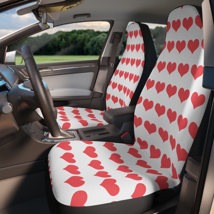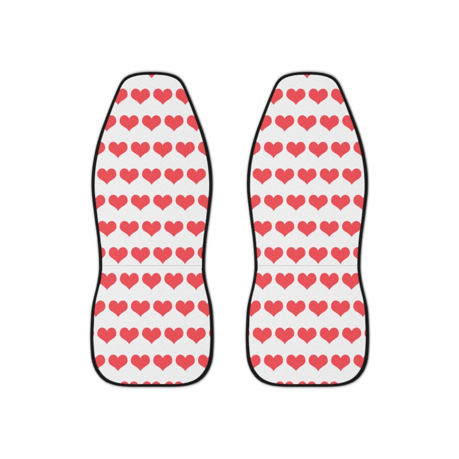 These red hearts car seat covers bring a playful, cozy touch to everyday drives. Soft-to-the-touch polyester with a high-quality, thick weave cushions seats while shielding them from spills, wear, and fading. The covers slip on easily and secure with two elastic hook straps and an elastic lining, giving a snug fit that stays in place through errands, commutes, and weekend getaways. The front panels showcase matching red heart prints on both covers, while a durable black back offers a clean, low-maintenance look. Lightweight and quick-drying, they’re made to refresh an interior without fuss — just be mindful to avoid use on seats equipped with side airbags.
