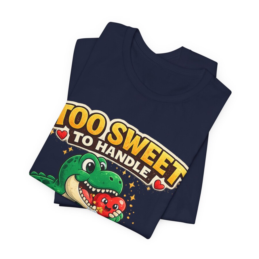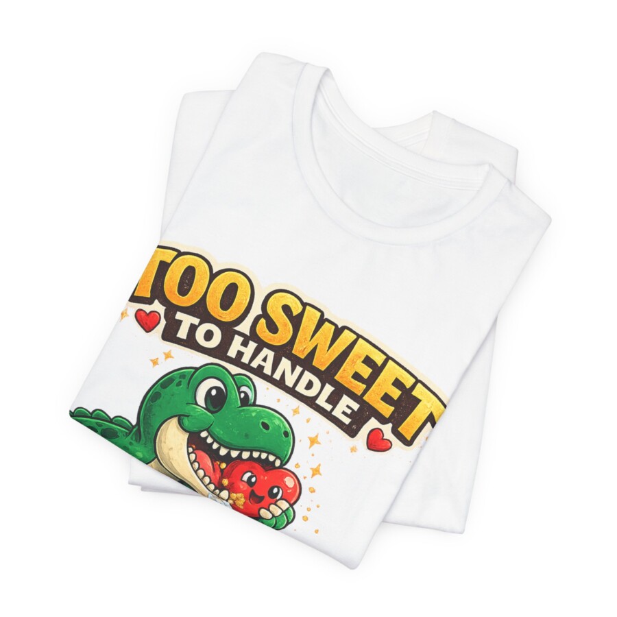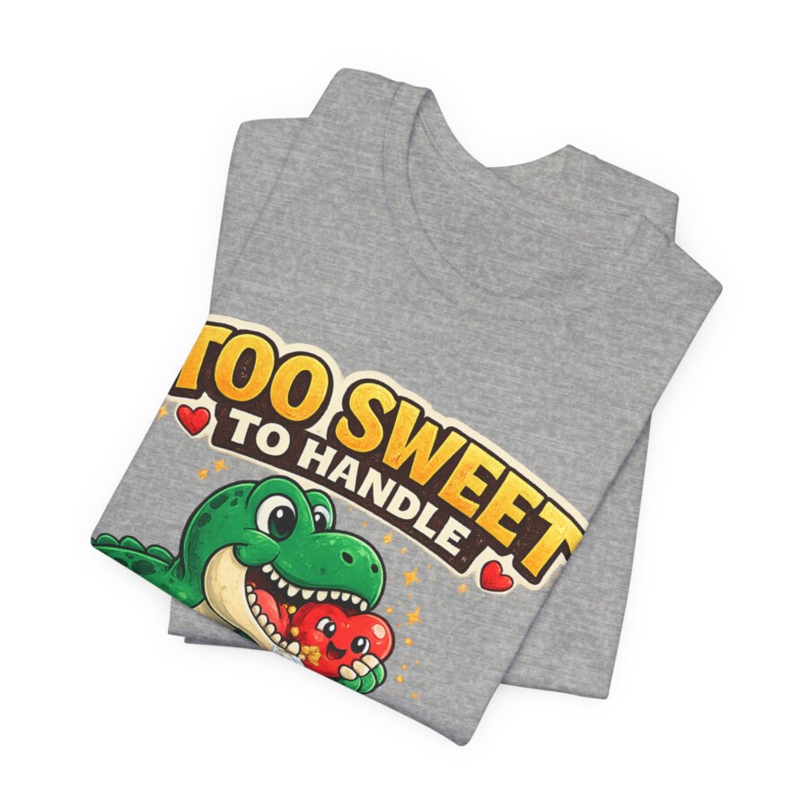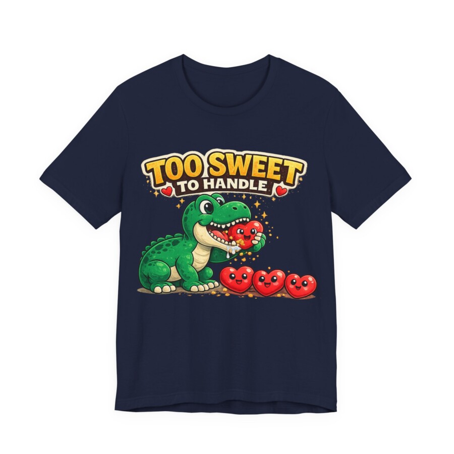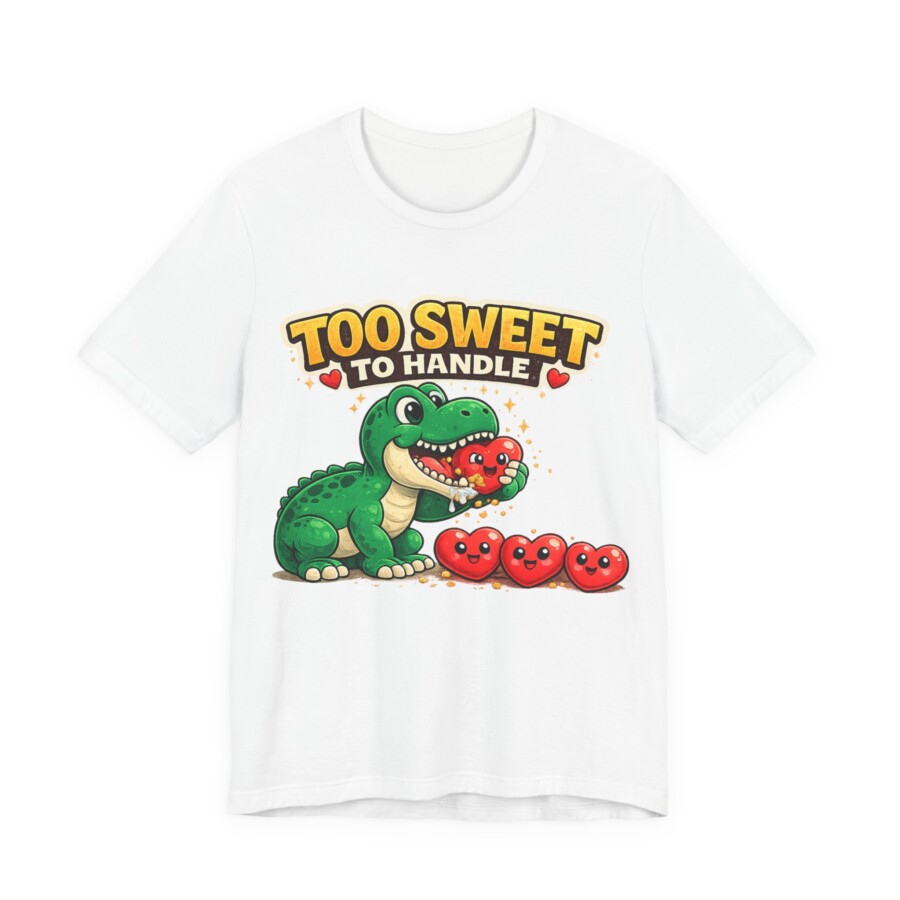 Too Sweet To Handle T-Shirt — Cute Dino Eating Hearts Valentine Tee, A light, playful tee that brings a little mischief to everyday wear. The front features a cartoon crocodile gently chomping a row of smiling strawberries under the cheeky headline “TOO SWEET TO HANDLE.” Soft, breathable cotton keeps the print feeling fresh and crisp while the retail fit and crew neckline sit neatly under jackets or stand alone on warm afternoons. Wear it to casual meetups, weekend markets, or whenever you want to share a wink and a smile—this shirt reads like an inside joke between friends and keeps the mood easy and fun.