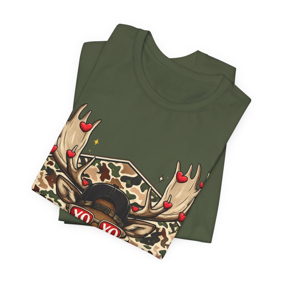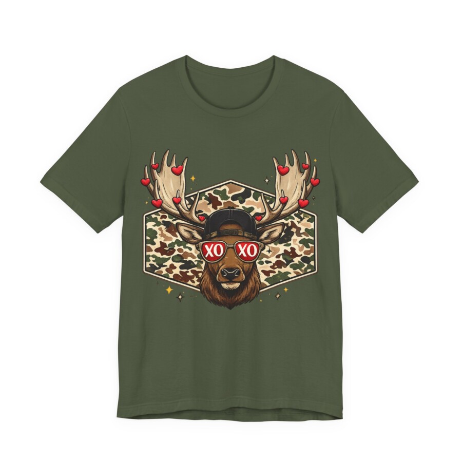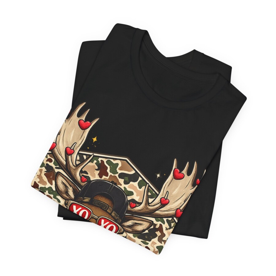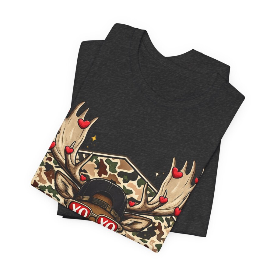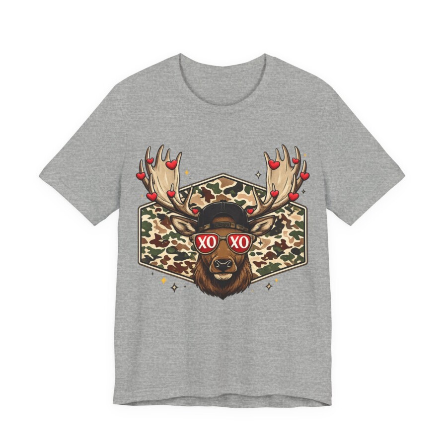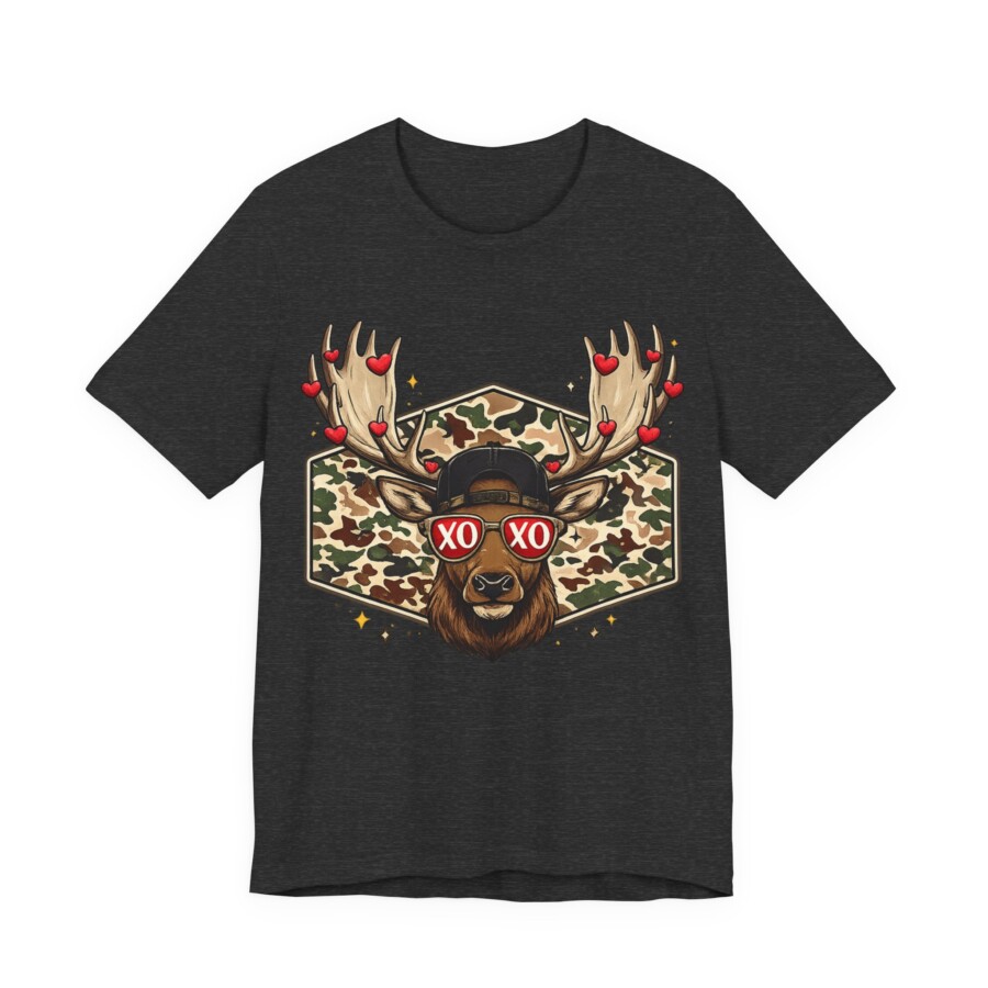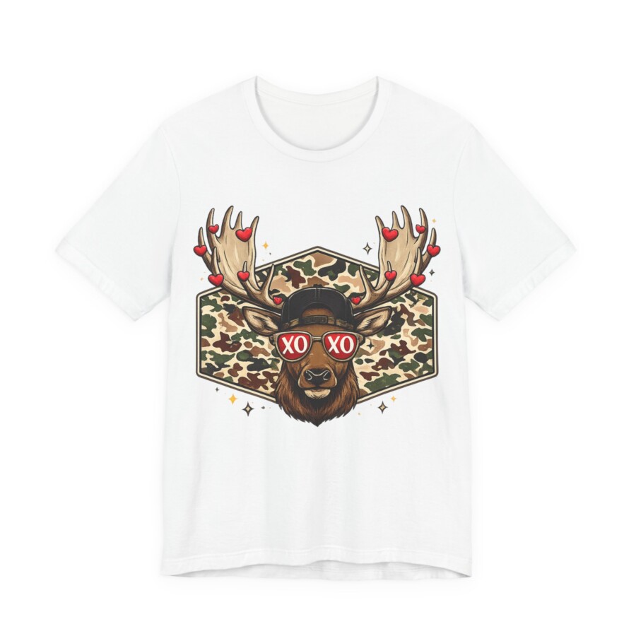 XO Sunglasses Reindeer Tee, This lightweight tee brings playful woodland charm to everyday wear. A confident buck stares out from a camo hexagon, sporting heart-dotted antlers and retro ‘XO’ shades — a wink of romance wrapped in outdoor style. The breathable Airlume cotton feels soft against skin and keeps you cool while layering or on its own. The retail crew neck and clean side seams give a neat silhouette that moves with you, whether you’re wandering trails, grabbing coffee, or lounging at home. Subtle details like the ribbed collar and tear-away label make it comfortable for long days. It blends rugged motifs with a fun, modern twist that speaks to people who love nature, humor, and a touch of street-ready flair.